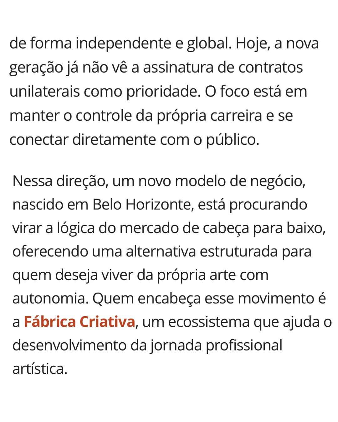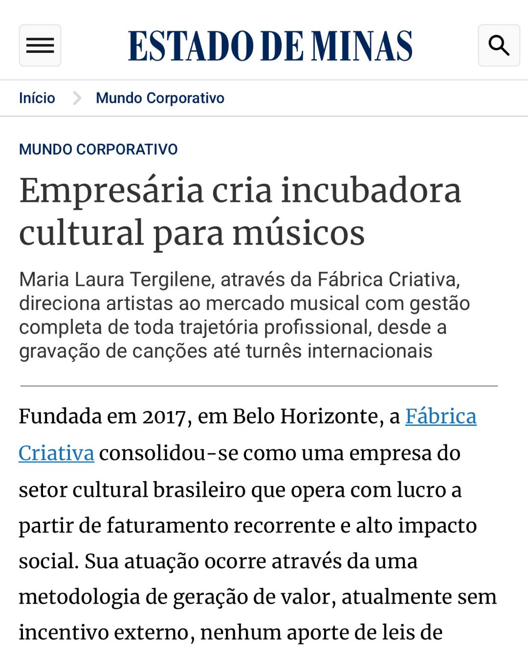Estado de MinasÉ com orgulho que compartilhamos nossa presença no Estado de Minas. A matéria destaca como a Fábrica Criativa, idealizada por Maria Laura Tergilene, se tornou a incubadora cultural que guia artistas em sua trajetória musical, com impacto social real e sem depender de incentivos externos. Desde 2017, já são mais de R$ 10 milhões transacionados e mais de 1.300 artistas beneficiados, com crescimento previsto de 500% ainda em 2025 Esse reconhecimento reforça nosso compromisso: transformar vidas por meio da música, com educação, produção e empreendedorismo. Obrigada a todos os artistas e parceiros que fazem parte dessa jornada!