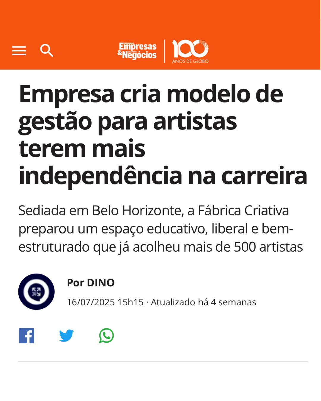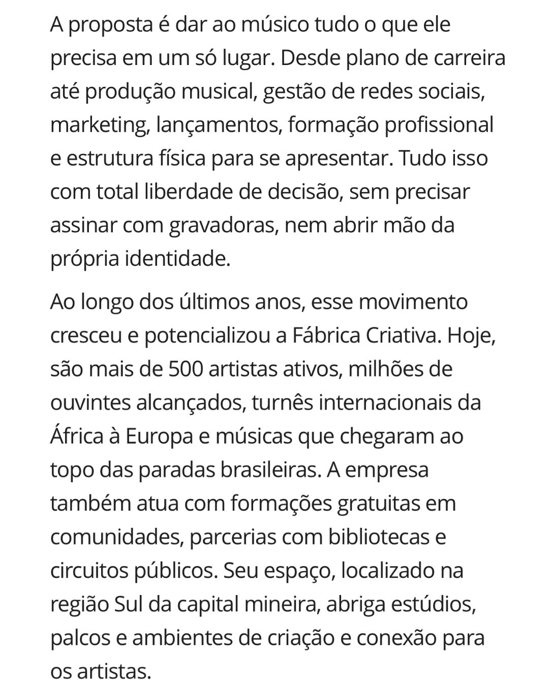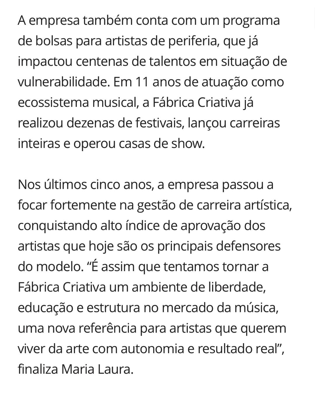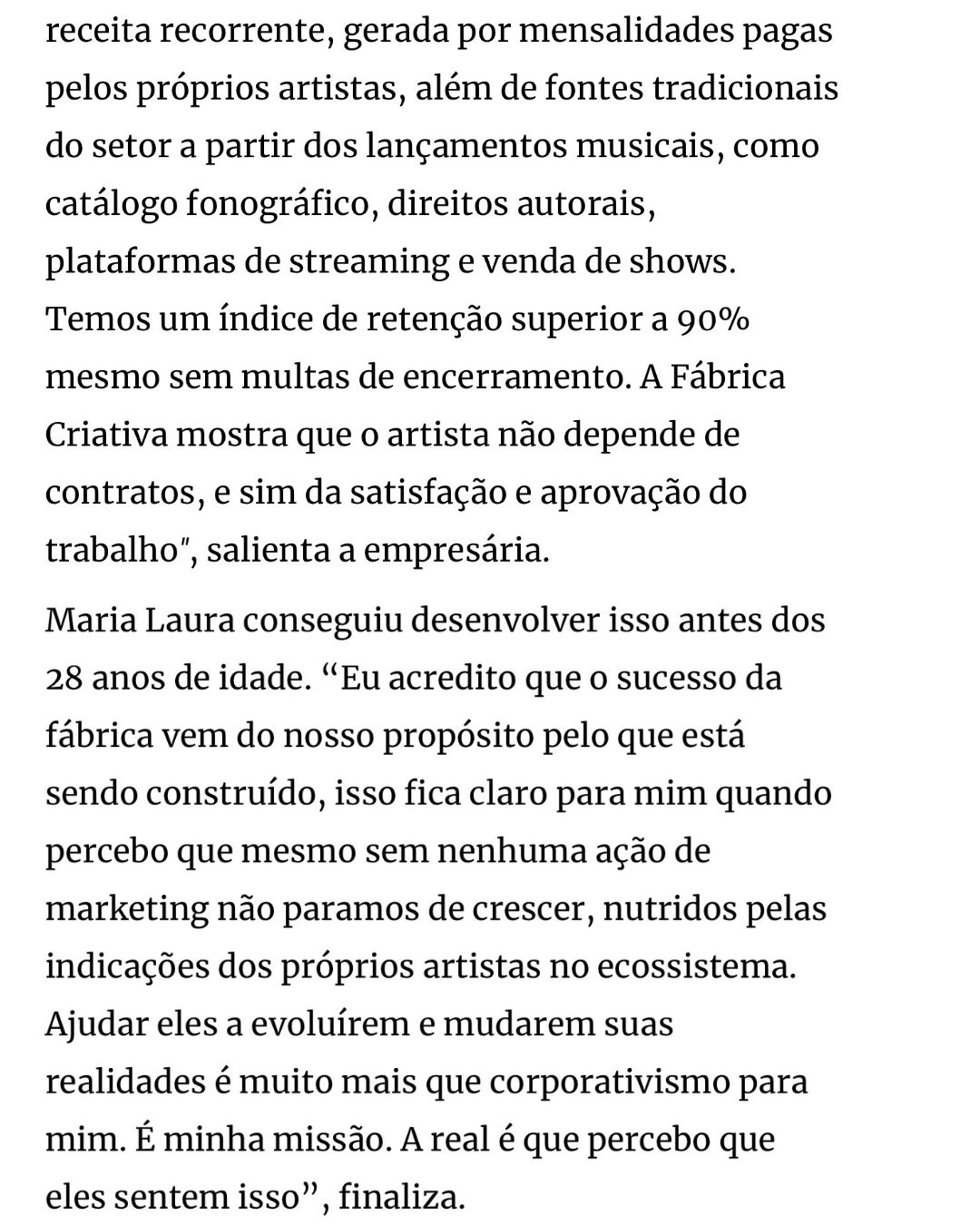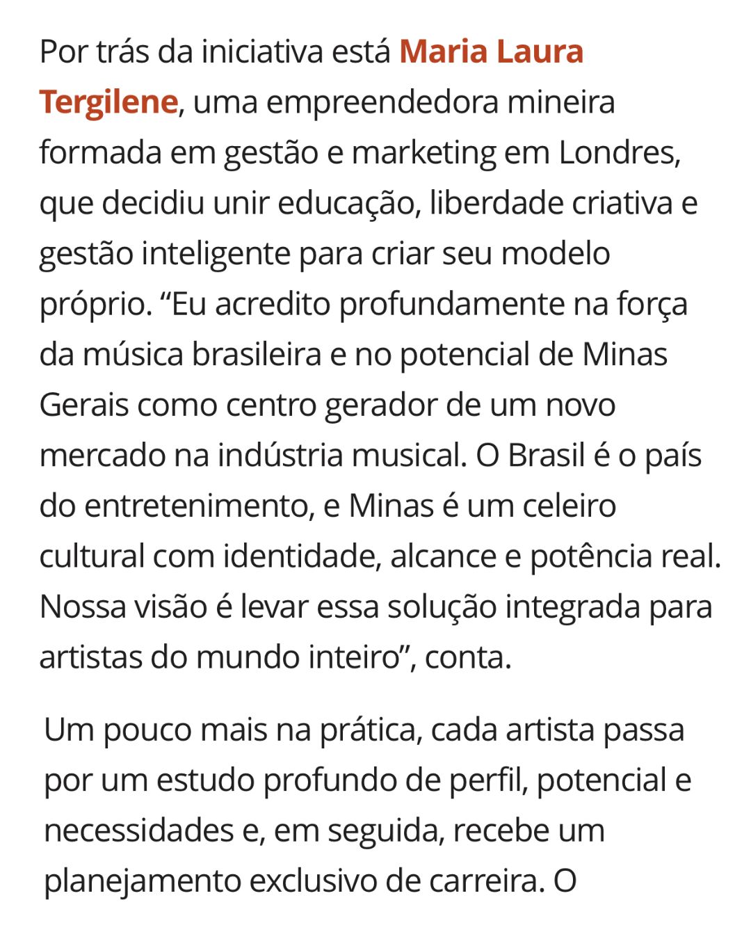 Peq. Empresas & Grandes NegóciosÉ com orgulho que compartilhamos nossa presença na Pequenas Empresas & Grandes Negócios. Esse reconhecimento reforça nosso compromisso: transformar vidas por meio da música, com educação, produção e empreendedorismo. Obrigada a todos os artistas e parceiros que fazem parte dessa jornada! A matéria destaca como a Fábrica Criativa, idealizada por Maria Laura Tergilene, vem transformando a lógica do mercado musical, oferecendo um modelo de gestão que garante aos artistas independência, estrutura e liberdade para conduzirem suas próprias carreiras. Hoje, já são mais de 500 artistas ativos, milhões de ouvintes alcançados, turnês internacionais da África à Europa e músicas que chegaram ao topo das paradas brasileiras.