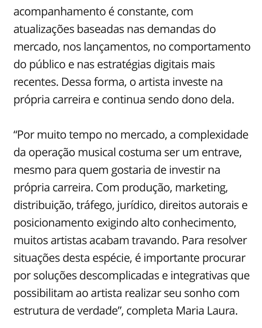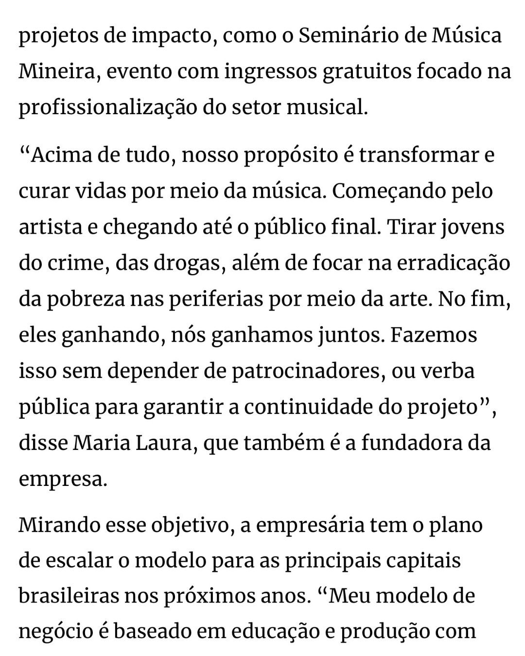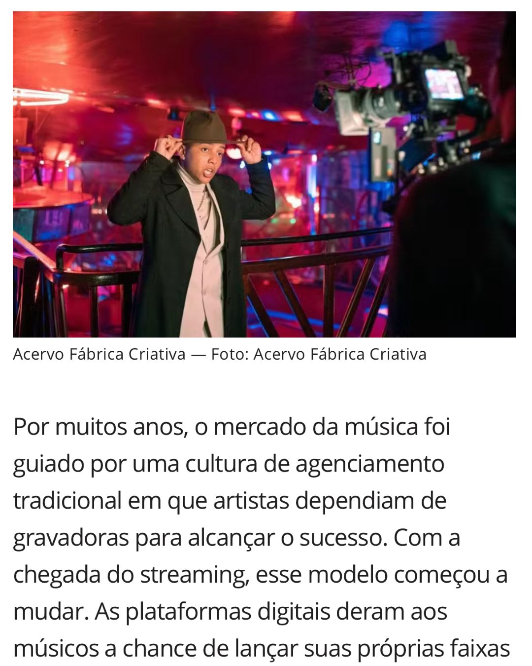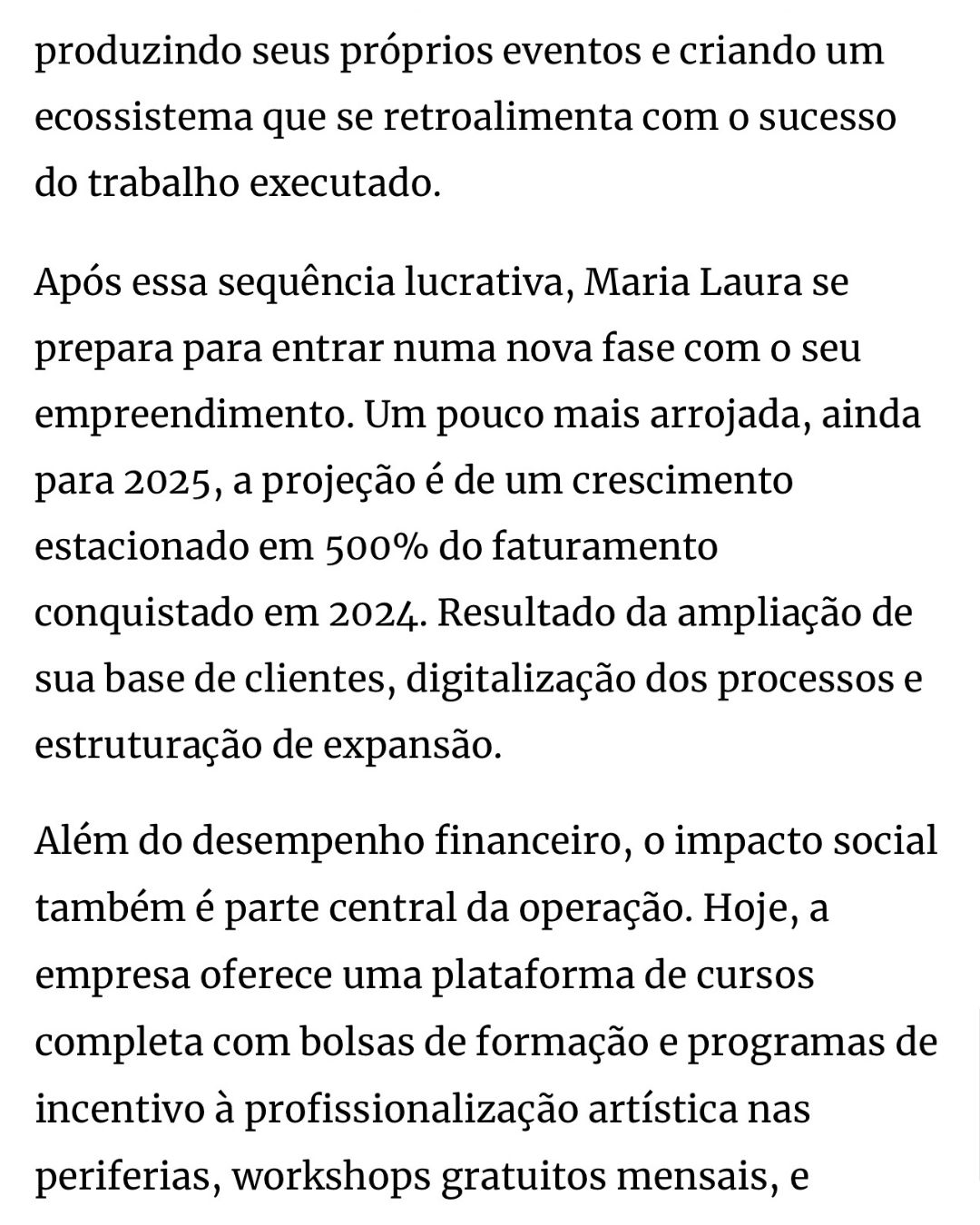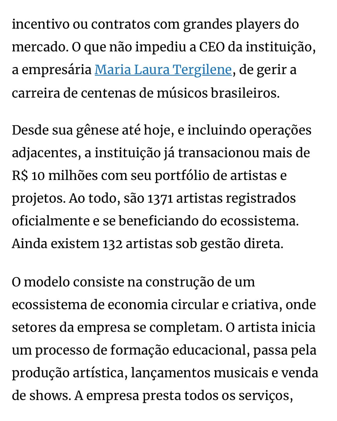 Peq. Empresas & Grandes NegóciosÉ com orgulho que compartilhamos nossa presença na Pequenas Empresas & Grandes Negócios. Esse reconhecimento reforça nosso compromisso: transformar vidas por meio da música, com educação, produção e empreendedorismo. Obrigada a todos os artistas e parceiros que fazem parte dessa jornada! A matéria destaca como a Fábrica Criativa, idealizada por Maria Laura Tergilene, vem transformando a lógica do mercado musical, oferecendo um modelo de gestão que garante aos artistas independência, estrutura e liberdade para conduzirem suas próprias carreiras. Hoje, já são mais de 500 artistas ativos, milhões de ouvintes alcançados, turnês internacionais da África à Europa e músicas que chegaram ao topo das paradas brasileiras.