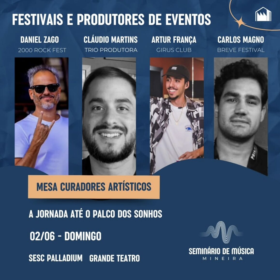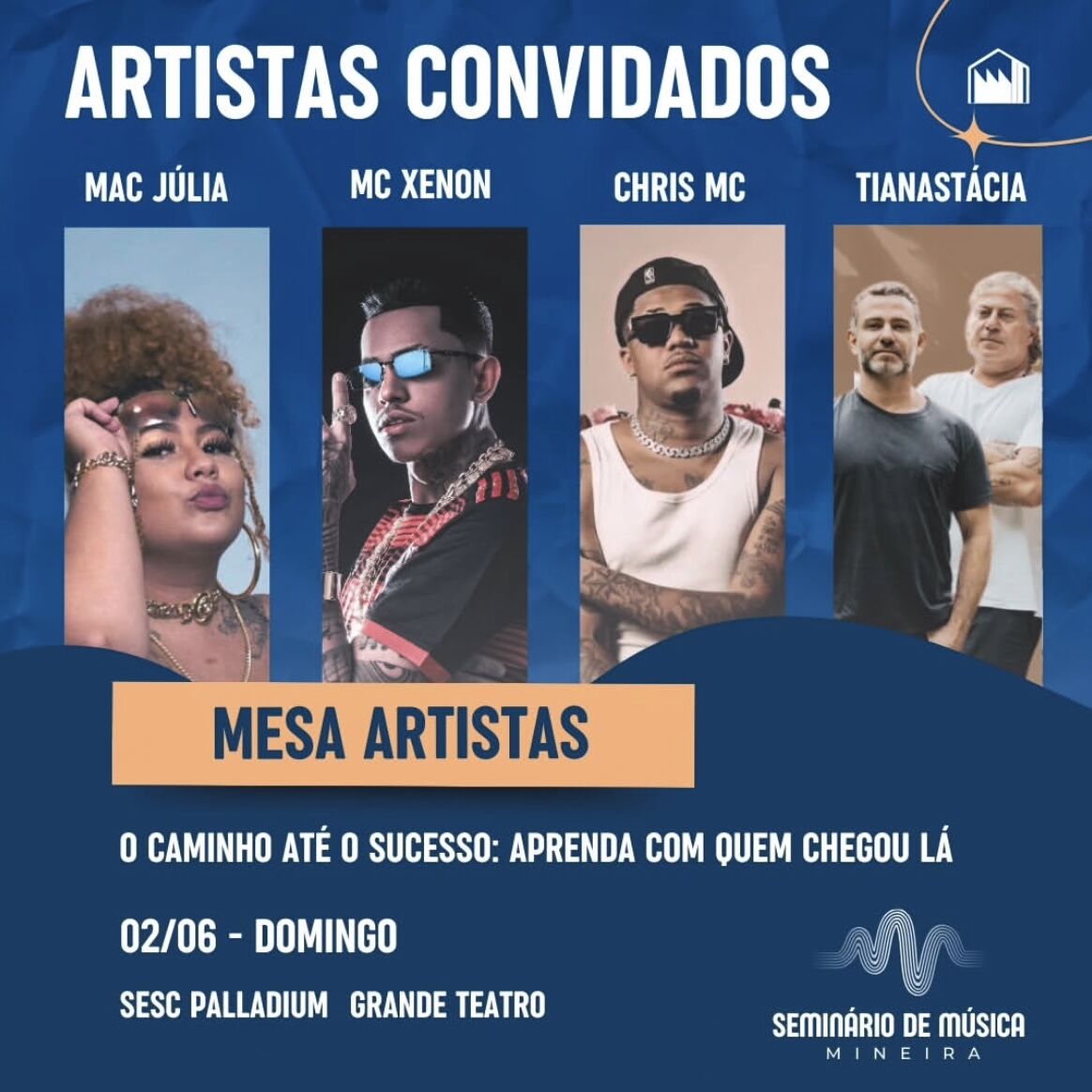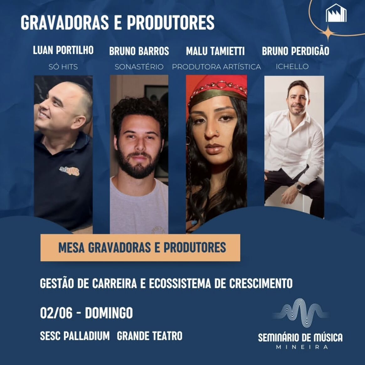 Seminário de Música Mineira 2024No ano passado, o palco do Sesc Palladium recebeu grandes nomes do mercado musical mineiro em um encontro transformador. O Seminário de Música Mineira 2024 foi marcado por diálogos abertos, trocas de experiências e muito aprendizado sobre os desafios e oportunidades do setor. Contando com diversas mesas: -Festivais e Produtores de Eventos – Daniel Zago, Cláudio Martins, Artur França e Carlos Magno compartilharam vivências sobre produção e organização de grandes projetos culturais. •Marketing Musical – Máxima Talents, Marketing de Cantores e Fredzak debateram estratégias de visibilidade e construção de imagem no mercado. •Direitos Autorais – Enio Medeiros (ECAD) trouxe reflexões essenciais sobre proteção da obra e valorização do artista. •Gravadoras e Produtores – Luan Portilho (Só Hits), Bruno Barros (Sonastério), Malu Tamietti e Bruno Perdigão discutiram sobre produção, lançamentos e inovação. •Artistas – Mac Júlia, MC Xenon, Chris MC e Tianastácia dividiram suas trajetórias e inspirações diretamente com o público. O evento foi um marco na profissionalização e no fortalecimento da cena musical mineira, reunindo artistas, produtores e agentes culturais em um só espaço de troca.